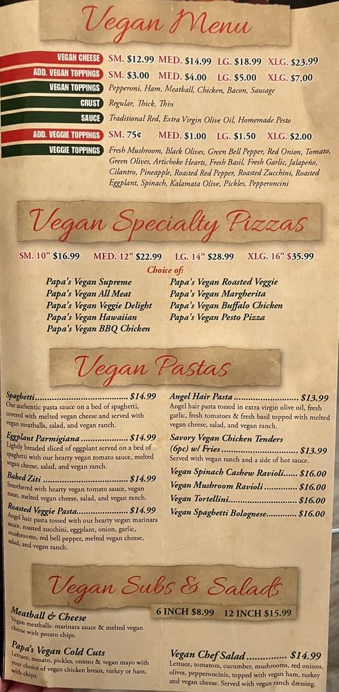 Introducing Papa Pizza Pie, a vegan and gluten-free pizza brand located in Fullerton, CA. Known for their delicious pizzas, loyal customers rave about the variety of vegan options available. From vegan meat lovers pizza to vegan cheesecake and wings, the menu offers something for everyone. Customers also praise the generous toppings, crunchy breadsticks, and flavorful fried zucchini. The establishment is women-owned and offers a casual, trendy atmosphere with options for delivery, takeout, and catering. With a focus on sustainability, Papa Pizza Pie provides compostable containers and plastic-free packaging. Whether you're looking for a quick bite or a group gathering spot, Papa Pizza Pie has you covered with their extensive menu and excellent service.